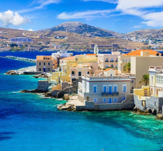 Syros is one of the few ‘green’ islands of Cyclades and is located in the center of the archipelago, known as the “Lady of the Cyclades” because of its cultural character, its position and its administrative importance. The largest towns are Ermoupoli, Ano Syros, and Vari.